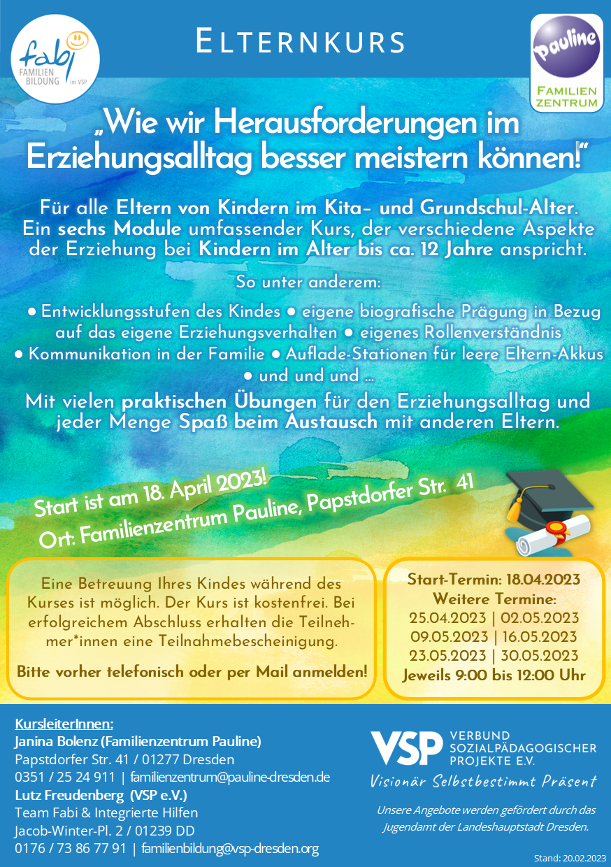 Elternkurs: "Wie wir die Herausforderungen im Erziehungsalltag besser meistern können!" - Familienzentrum "Pauline", Papstdorfer Str. 41