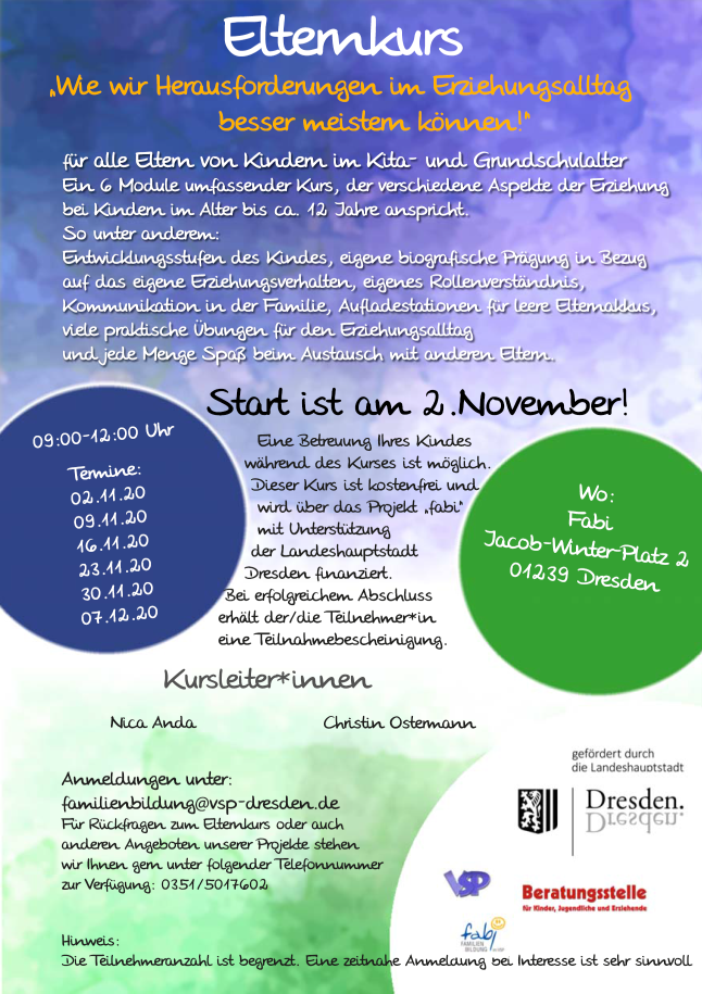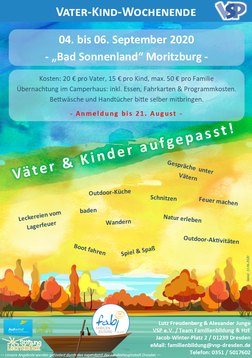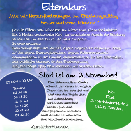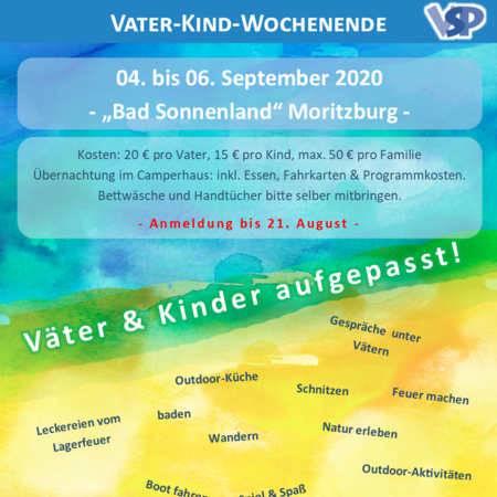 Den Auftakt macht unser Vater-Kind-Wochenende im September, dann geht es weiter mit einer Bildungsveranstaltung zum Thema "Medien" im Oktober, gefolgt von einem Elternkurs in Zusammenarbeit mit der Beratungsstelle im November.