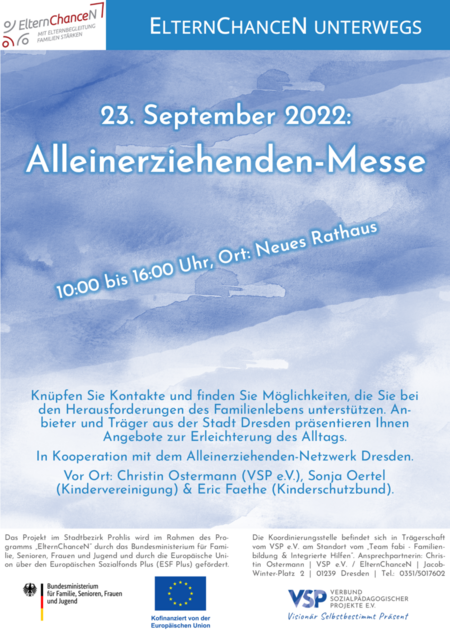 Das Projekt im Stadtbezirk Prohlis wird im Rahmen des Programms „ElternChanceN“ durch das Bundesministerium für Familie, Senioren, Frauen und Jugend und durch die Europäische Union über den Europäischen Sozialfonds Plus (ESF Plus) gefördert.