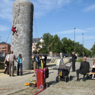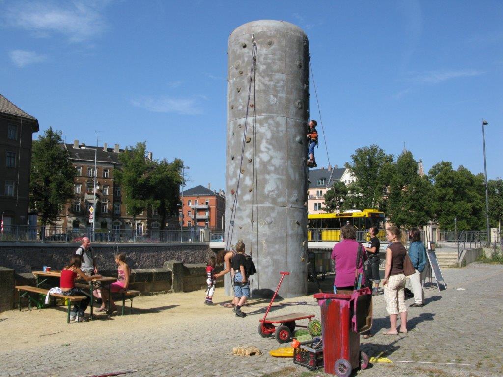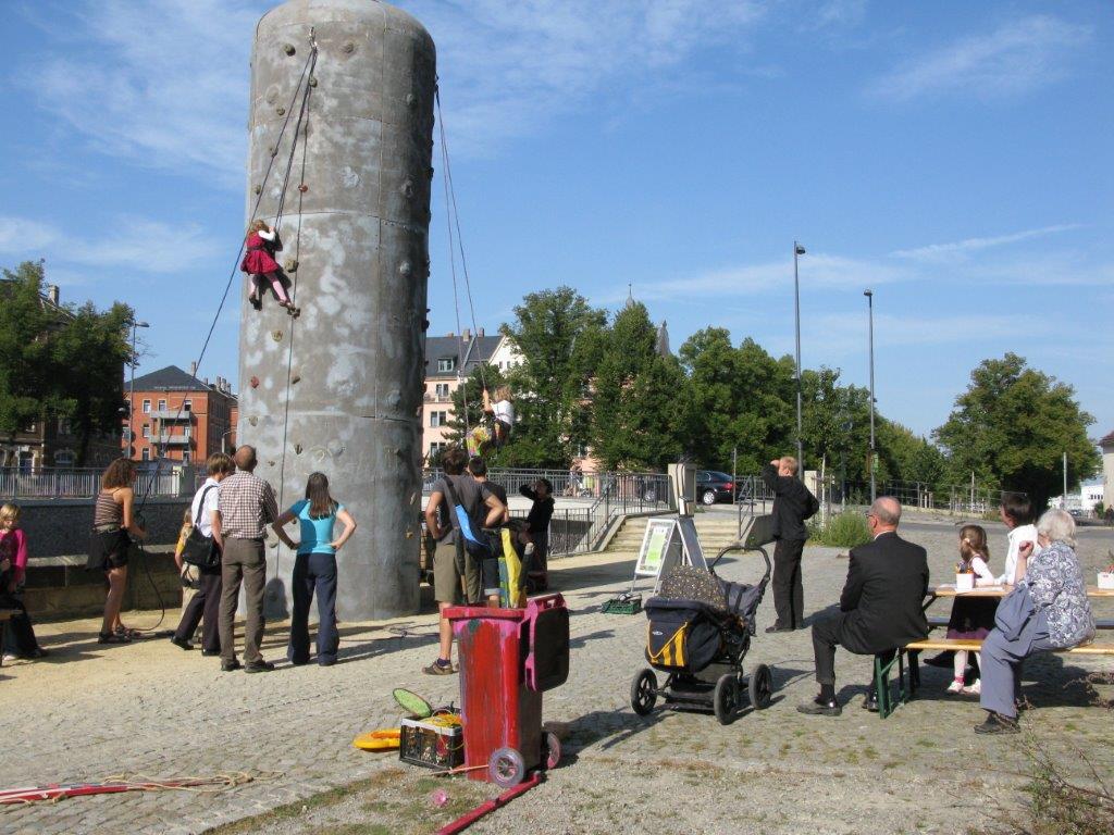 Auch außerhalb unserer Türen sind wir unterwegs: Jedes Jahr im Juni veranstalten wir an der Weißeritz vor Bienerts-Laden eine Trampolinwoche. Dabei sind wir mit unserem im Durchmesser 3,50 Meter großen Trampolin vor Ort. Mitte September steht an gleicher Stelle dann ein Kletterturm, der im Rahmen unserer Plauener Kletterwoche vormittags von Schulklassen und nachmittags von Kindern, Jugendlichen und Erwachsenen genutzt werden darf. Immer im Sommer beteiligen wir uns am Müllerbrunnenfest am F.-C.-Weiskopf-Platz. Auch an manchen Schulfesten nehmen wir mit verschiedenen Aktionen teil.