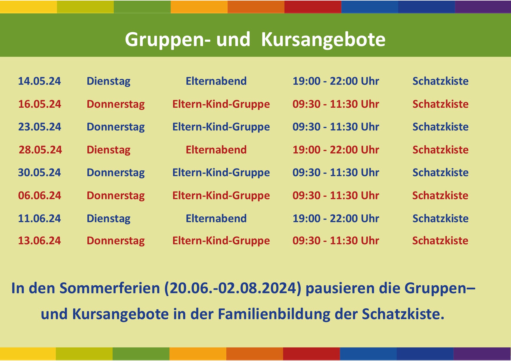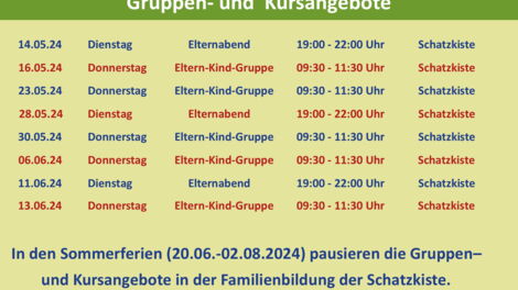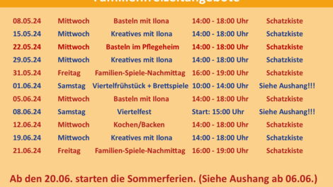 Siehe die Aushänge unten!!! (Familienfreizeitangebote und Gruppen- und Kursangebote)