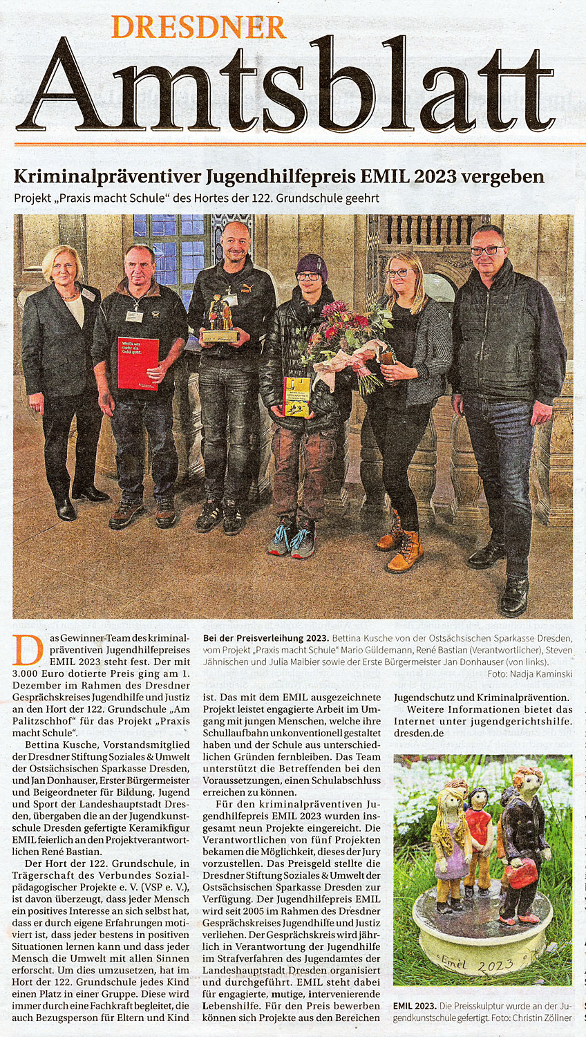 Der Gewinner des kriminalpräventiven Jugendhilfepreises EMIL 2023 steht fest. Der mit 3.000 Euro dotierte Preis ging am Freitag, 1. Dezember 2023, im Rahmen des Dresdner Gesprächskreises Jugendhilfe und Justiz an den Hort der 122. Grundschule „Am Palitzschhof“ für das Projekt „Praxis macht Schule“.