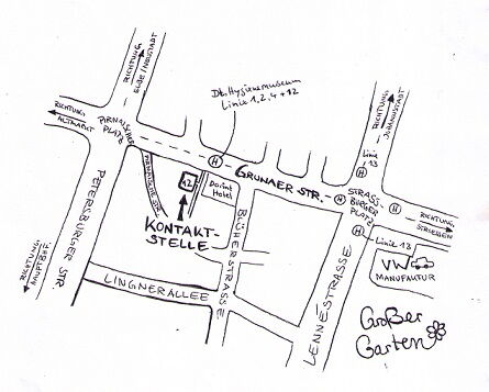 Die Kontaktstelle befindet sich auf der Grunaer Straße 12 in Dresden zwischen Pirnaischen Platz und Strassburger Platz. Sie erreichen uns mit den Straßenbahnlinien 1,2,4 und 12 bis Haltestelle Dt.Hygienemuseum. Rechts neben dem Dorinthotel etwa 20 Meter von der Straße nach hinten versetzt befindet sich das Haus Grunaer Straße 12. Den Eingang zur Kontaktstelle finden Sie direkt auf der linken Seite des Hauses. Bitte nutzen Sie nicht den Haupteingang der Nummer 12.