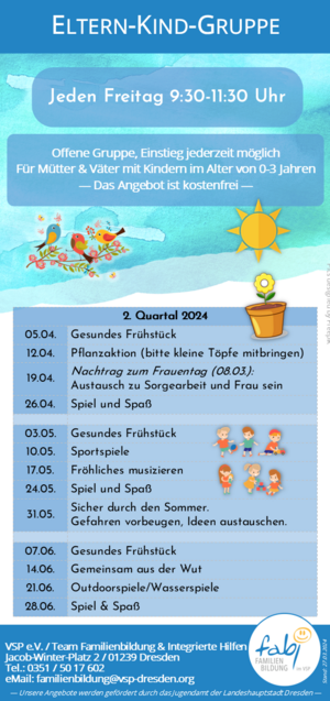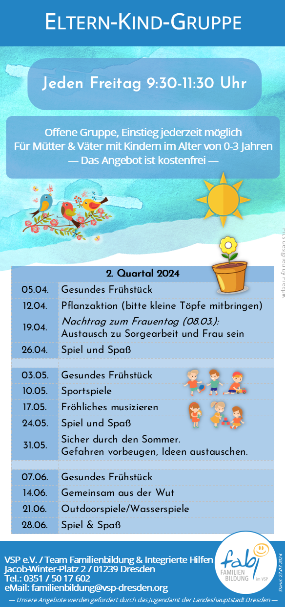 Wie gehabt trefft ihr uns zu unseren regulären Angeboten vor Ort: zum Familientreff am Montag und Freitag jeweils 15 bis 18 Uhr, zur Eltern-Kind-Gruppe freitags 9:30 bis 11:30 Uhr und zu individuellen Beratungen nach telefonischer Terminvereinbarung.