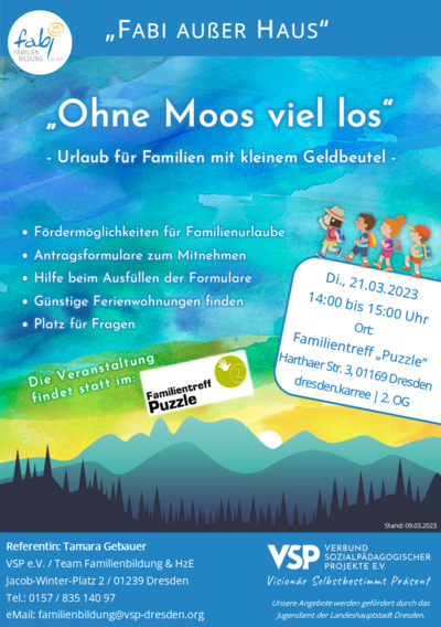 Infoveranstaltung: "Ohne Moos viel los - Urlaub für Familien mit kleinem Geldbeutel" - im Familientreff "Puzzle", Harthaer Str. 3