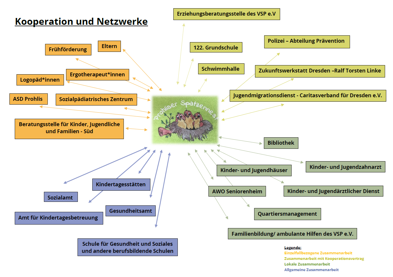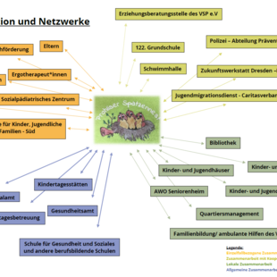 Im Sinne des Wohlergehens unserer Kinder und eines sozialraumorientierten Arbeitsansatzes stellen wir engagiert und verbindlich die notwendigen Kooperationsbezüge zu den unterschiedlichsten Einrichtungen und Institutionen her.